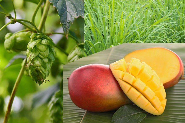 Myrcene: Most cannabis strains are dominant in either myrcene or caryophyllene. Myrcene is also predominant in hops and lemongrass, and has been described as earthy, herbaceous, spicy and musky. Myrcene gives cannabis a mildly sweet flavor profile and is also found in mangoes.